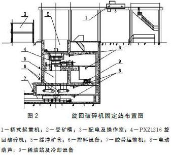 國內(nèi)以旋回破碎機作為主機的破碎站大都是固定破碎站,國外同類產(chǎn)品中雖有相近能力的半移動破碎站,因為價格或者其他因素,在國內(nèi)應(yīng)用較少。所以以固定式破碎站作為比較對象,其配置如圖2。